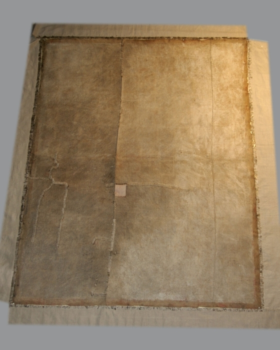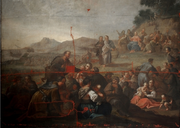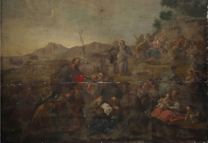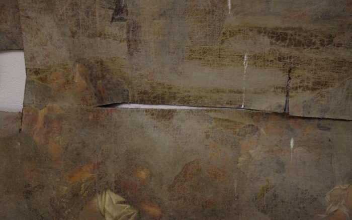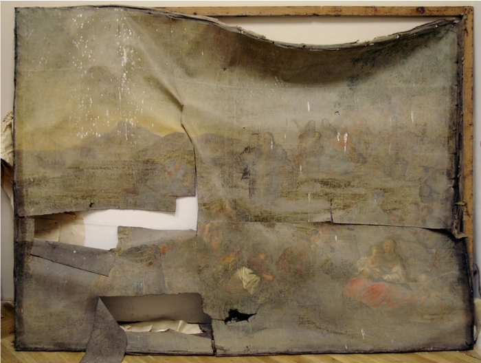 Obraz se skládá ze tří částí k sobě sešitých, které se však rozpadly. Obraz byl poničen také mechanicky, mnohé perforace byly dílem vandalismu. Obraz postrádal napínací rám a došlo tedy ke zvlnění plátna. Přibližně uprostřed obrazu byl vyříznut čtverec o velikosti 10 x 10 centimetrů, který se nedochoval. Malba v okolí perforací a ruptur se nedochovala. Zbylé plochy byly silně krakelované se silnými nánosy závěrečného laku, který se zakalil a způsobil velmi malou čitelnost malby. Malba byla rovněž uvolněna od podkladu. Některé indicie ukazovaly na napadení díla plísněmi.